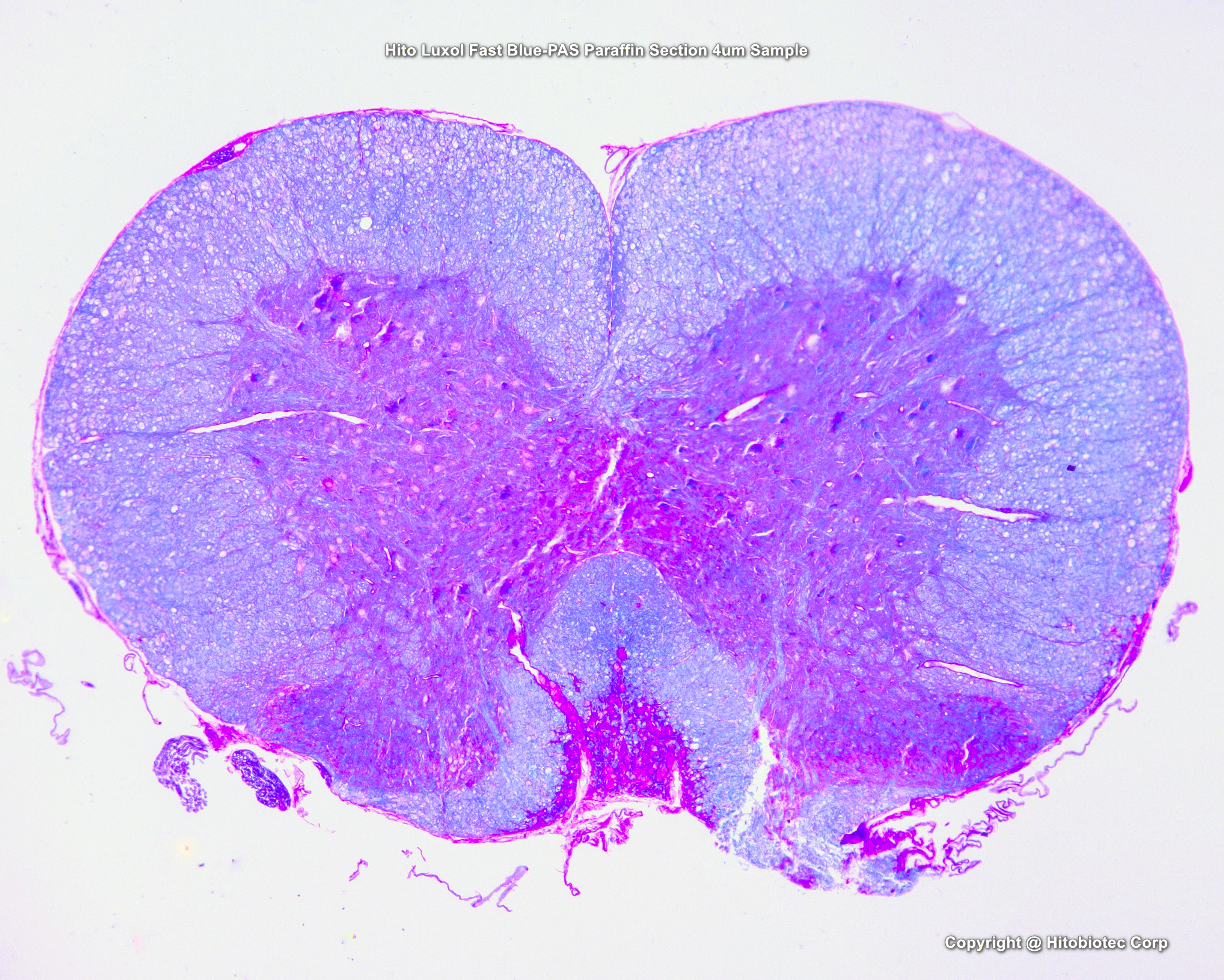 Hito Luxol Fast Blue - PAS OptimStain™ Kit is designed based on Luxol fast blue and Periodic acid-Schiff (PAS) method. This kit is made in a ready-to-use format and offers high quality, rapid staining (can be finished in one hour) of myelin/myelinated axons on paraffin sections or frozen sections. It has been proven to be extremely reliable and sensitive to demonstrate the morphological details of myelin fibers.